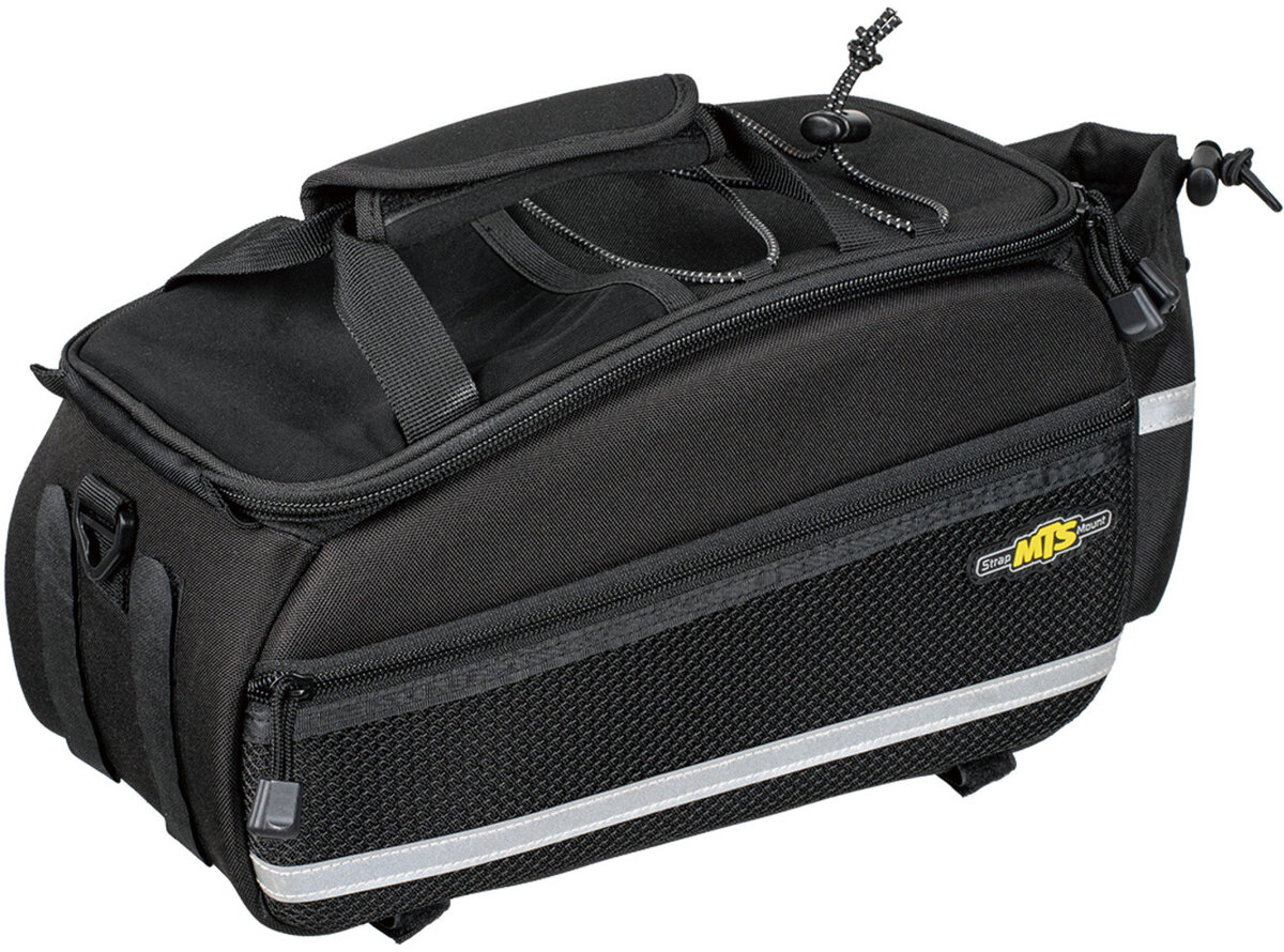 S’attache au porte-bagages à l’aide de courroies à velcroCompartiment principal diviséSupport à bidon, bandoulière et poignée de transport inclusCordage élastique sur le dessus